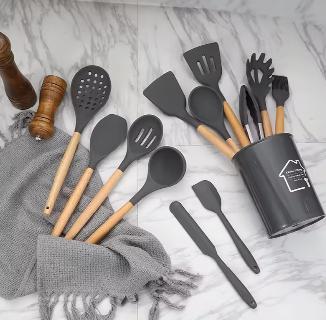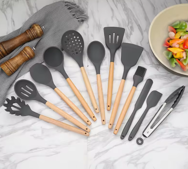 Crafted with food-grade silicone, the utensil heads are non-stick, scratch-proof, and safe for use with all cookware—including pans, pots, and woks. They withstand high temperatures, preventing melting or warping during cooking, while the wooden handles offer a comfortable, anti-slip grip and stay cool to the touch.